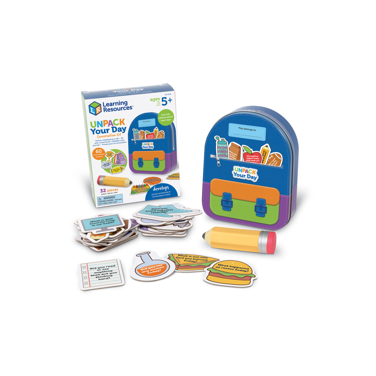 What did you do today? Unpack the school day's triumphs, challenges, and interesting moments with kid-friendly conversation starters in the Unpack Your Day Conversation Kit, a social-emotional learning toy from Learning Resources. Packed with 60 age-appropriate conversation prompts, this set's 30 conversation cards help get kids talking about everything from favorite moments in the classroom to challenges with friends to thoughts about life at home—you can even turn chats into a social-emotional learning game! Plus, the set's squishy fidget pencil helps kids stay focused and engaged as they share their thoughts and feelings. When chats are done for the day, the Unpack Your Day Conversation Kit's pieces return to the fun backpack tin for easy clean-up—you can even take this social-emotional learning toy with you for on-the-go talks!