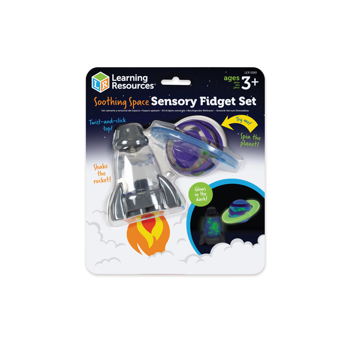Discover an out-of-this-way to fidget while building sensory skills! This set of two awesome astro sensory tools comes with multiple ways to fidget—spin the fidgety planet sphere, listen to the moon rocks rattle, and find the hidden alien, or peer through the fidget rocket's glitter to spot the astronaut inside. This set's surprises don't stop there—twist the rocket's top for a fun clicking sound, then turn the lights off and discover glow-in-the-dark elements! These one-piece fidgets are ready for on-the-go play. Age 3+ | Grade PreK+