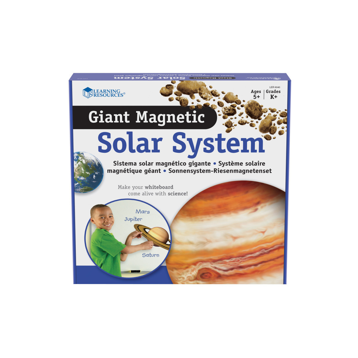 Giant Magnetic Solar SystemFull-color, realistically detailed magnets capture students' attention as you model space science concepts on your whiteboard. Includes 8 planets, Pluto (dwarf planet), Sun, Earth's moon, asteroid belt and Activity Guide. Largest magnet (Sun) measures 10" in diameter. Grades K+