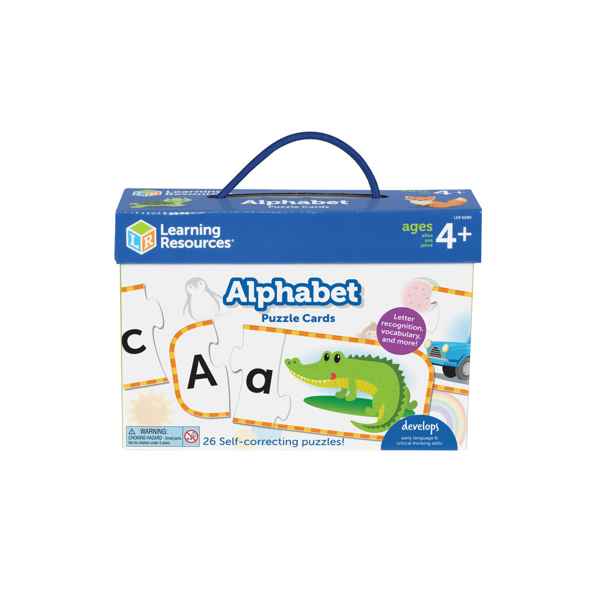 Build new kindergarten readiness skills, one piece at a time! Get your little ones learning and playing at the same time with the Alphabet Puzzle Cards from Learning Resources. This set of 26 colorful three-piece puzzles helps kids master early alphabet and language skills through brain-teasing puzzle play. Each puzzle features one letter of the alphabet in uppercase and lowercase form, as well as a full-color image of a vocabulary word that begins with that letter; from alligator to zebra, your kids will pick up new language skills as they play. Designed with little ones in mind, each puzzle is self-correcting, which makes it easier for kids to puzzle out the one right answer. Each set of Alphabet Puzzle Cards comes in a sturdy reusable box that doubles as a storage container when playtime is done.