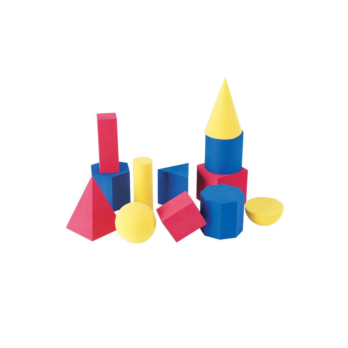 Geometric shapes made of quiet Hands-On Soft™ foam. Shapes come in three colors and measure 2- 3. Set of 12 includes: cones, sphere, hemisphere, cube, cylinders, pyramid, prisms, rectangular solid shapes, storage tub and Teaching Guide.