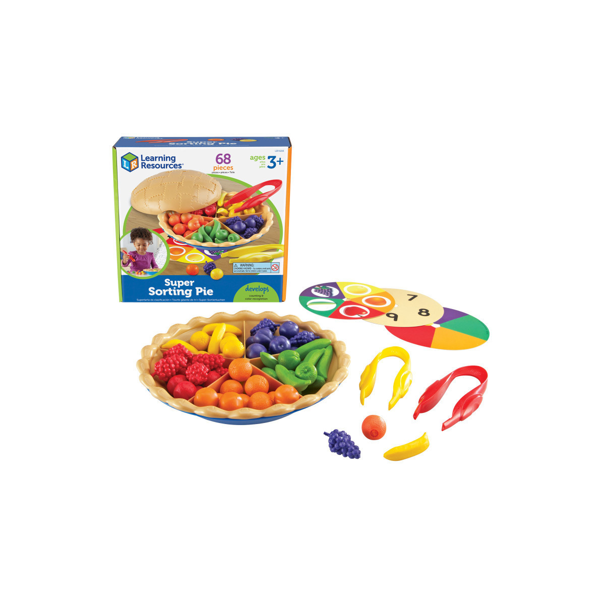 Includes 60 counters (7 fruits in 5 different colors), Plastic pie plate with cover & removable divider, 3 double-sided sorting cards, 2 jumbo tweezers, and activity guide. Pie measures 8.75" D.