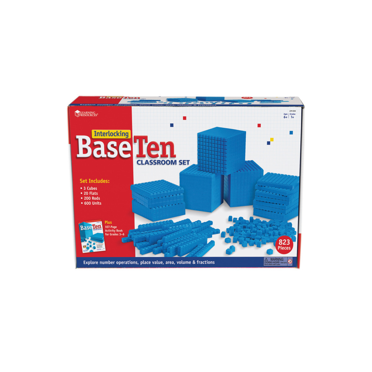 Class Set includes 600 units, 200 rods, 20 flats, 3 cubes, 96-page book in box. This unique set of Base Ten components conveniently interlocks to teach math concepts, value and grouping while enabling students to easily manipulate and visualize varying quantities. Older students can explore spatial relationships and volume.