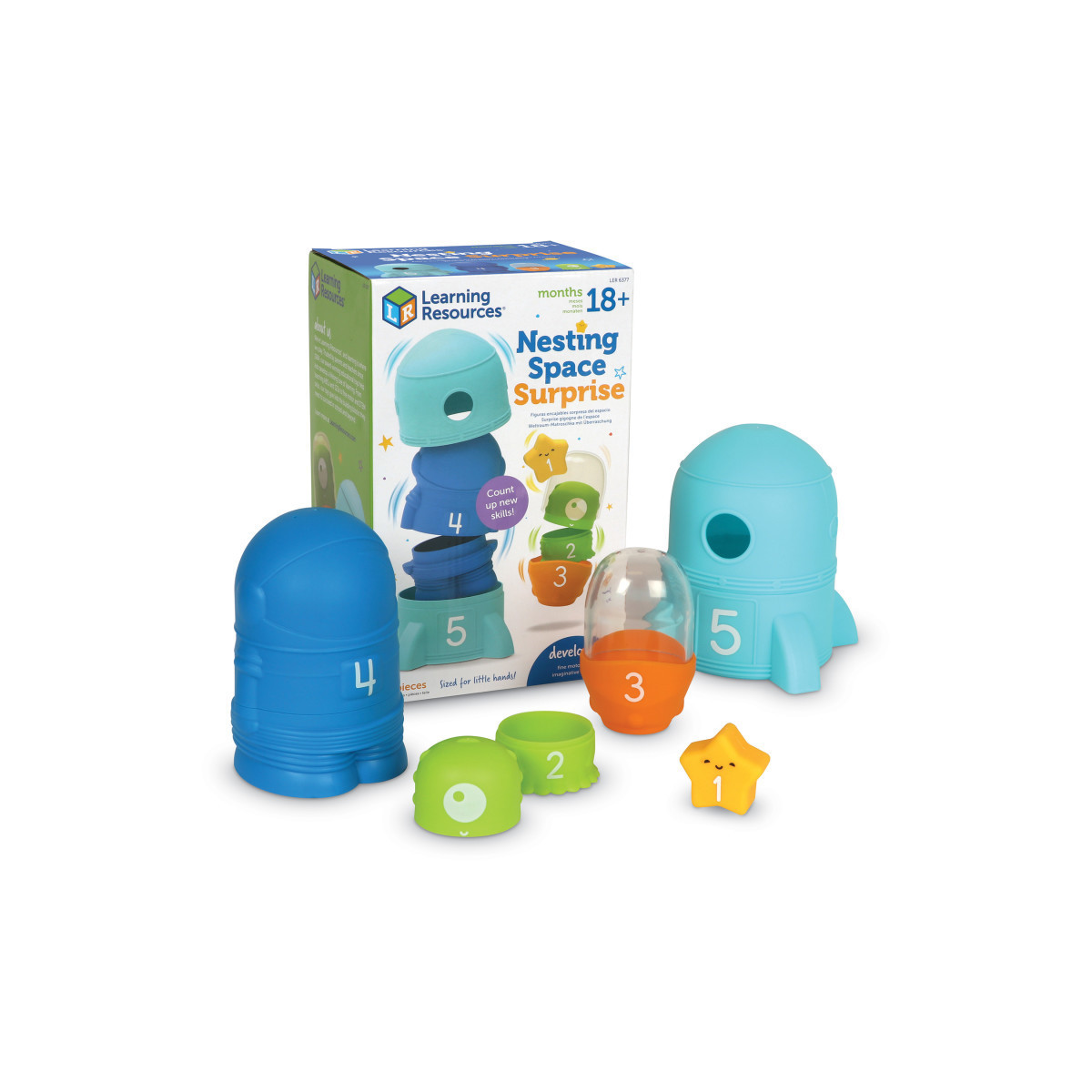 Blast off on imaginative astro adventures! Kids build all kinds of essential preschool skills with the help of the nesting space friends in the Nesting Space Surprise set, one of the preschool learning toys from Learning Resources! Pop open this educational toy's two-piece rocket to reveal an astronaut, UFO, alien, and star—sized for little hands, these preschool learning toys help kids develop hand strength, coordination, and other essential fine motor skills every time they play. Each numbered nesting figure in this toddler toy also helps kids count 1-5 strengthen number recognition. Plus, friendly astronaut, alien, and star friends are ready for imaginative interstellar adventures. When fine motor fun is done for the day, the Nesting Space Surprise's piece store inside for easy clean-up until it's time to play with this preschool toy again!