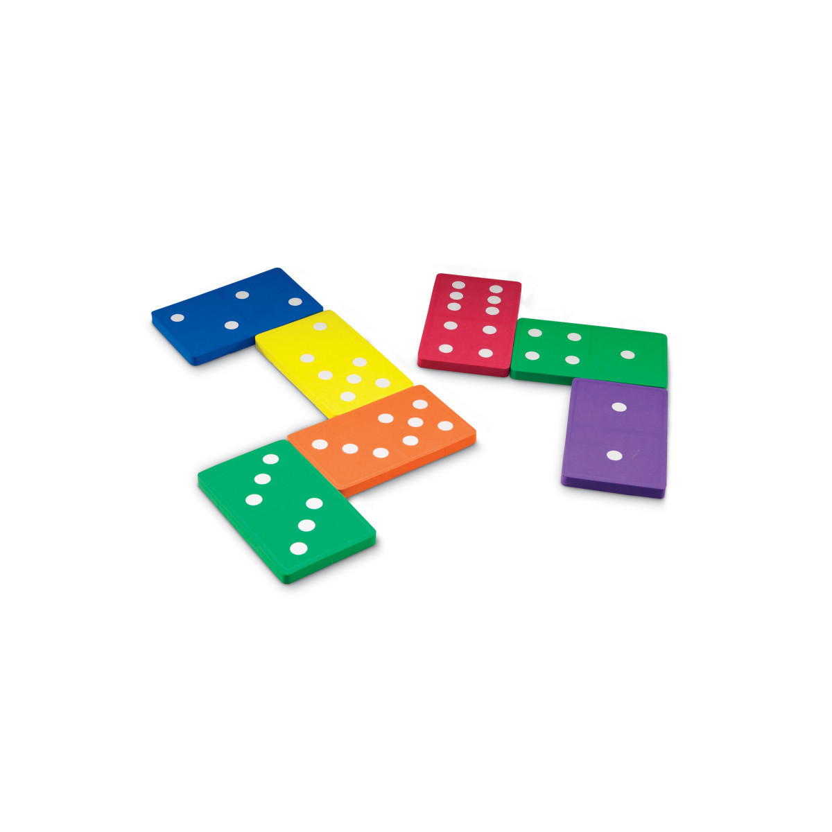 Domino math has never been so quiet! Lightweight soft foam allows for quiet individual or group activities and game play. Jumbo size makes them easy for younger students to manipulate. Use for sorting, patterning, arithmetic, fractions and logic problems. Set of 28 double-six dominoes comes in 6 bright colors – red, blue, yellow, orange, green and purple– with white dots. Activity guide and storage case included. Dominoes measure 5"L x 3"W x 2/5"D.