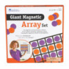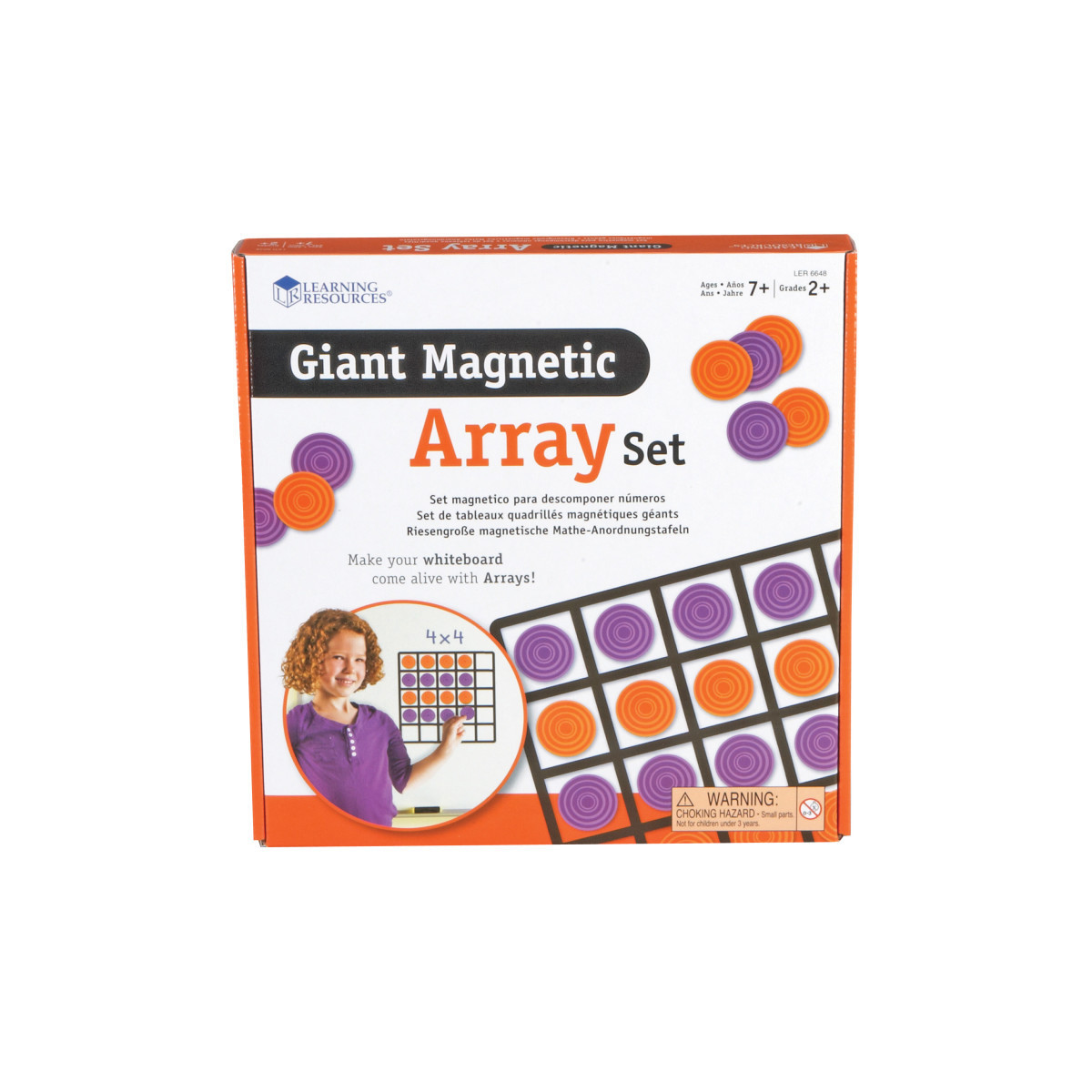 Grab students' attention with jumbo math tools, on your board and in living color! Set of two magnetic 5 x 5 arrays include 50 purple and orange magnetic counters to demonstrate repeated addition, multiplication, number facts and representations, and much more! Also includes an Activity Guide featuring ideas for cooperative work with the entire class. All eyes up front—class is in session! Includes: 2 magnetic 5 x 5 arrays, 25 purple magnetic discs, 25 orange magnetic discs, and activity guide. Arrays measure 9.75" x 9.75".