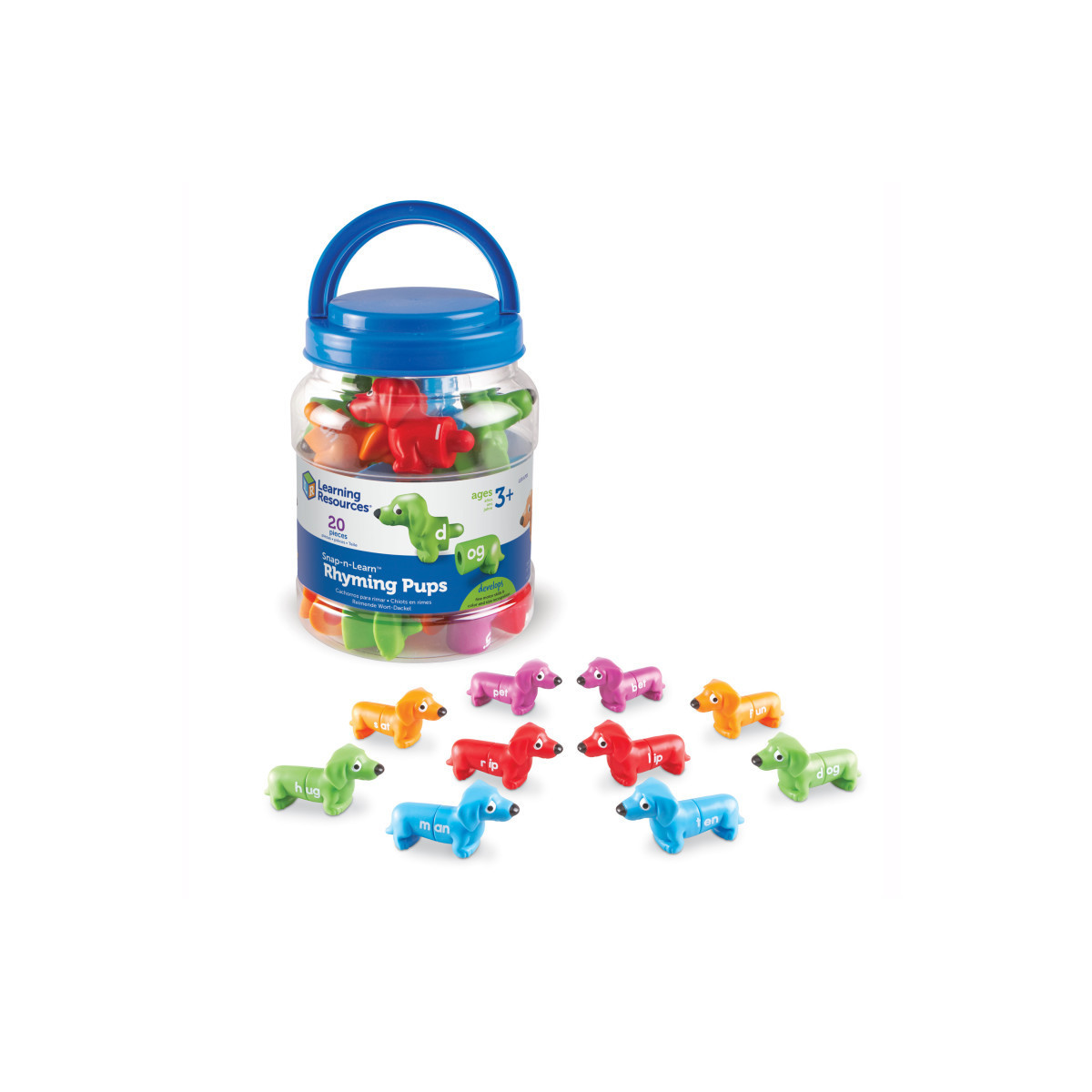 Colorful puppy friends snap together and pull apart to make rhyming words. Set includes 10 heads and 10 tails that can be mixed and matched to make over 55 rhyming words. Start by matching colors and identifying letters, then move on to building three-letter words and rhyming. Great for reinforcing fine motor skills. Includes a sturdy storage bucket with handle. Each pup measures 4½"L x 2"H.