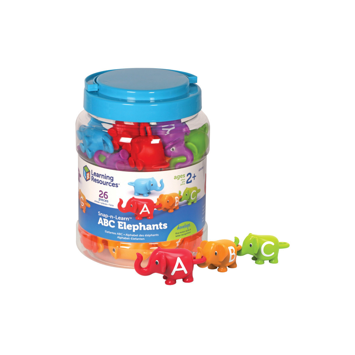 The elephants are on parade, and they're bringing the alphabet with them! Kids learn their ABCs during imaginative animal play sessions with the Snap-n-Learn ABC Elephants from Learning Resources. Printed with every letter of the alphabet, these 26 colorful elephants come with snap-together trunks and tails that make learning language skills easy and fun. Elephants come in five vibrant colors—red, orange, green, blue, and purple—and their easy-to-grab plastic construction makes it simple for little hands to develop fine motor skills during each engaging play session. The Snap-n-Learn ABC Elephants from Learning Resources also grow along with kids' skills; once they've mastered snapping elephants together in alphabetical order, little ones can also snap their elephants together to form simple words and work on basic vocabulary skills. When play time is over, each set of Snap-n-Learn ABC Elephants fits easily within the included tub, making cleanup and storage simple and fast.