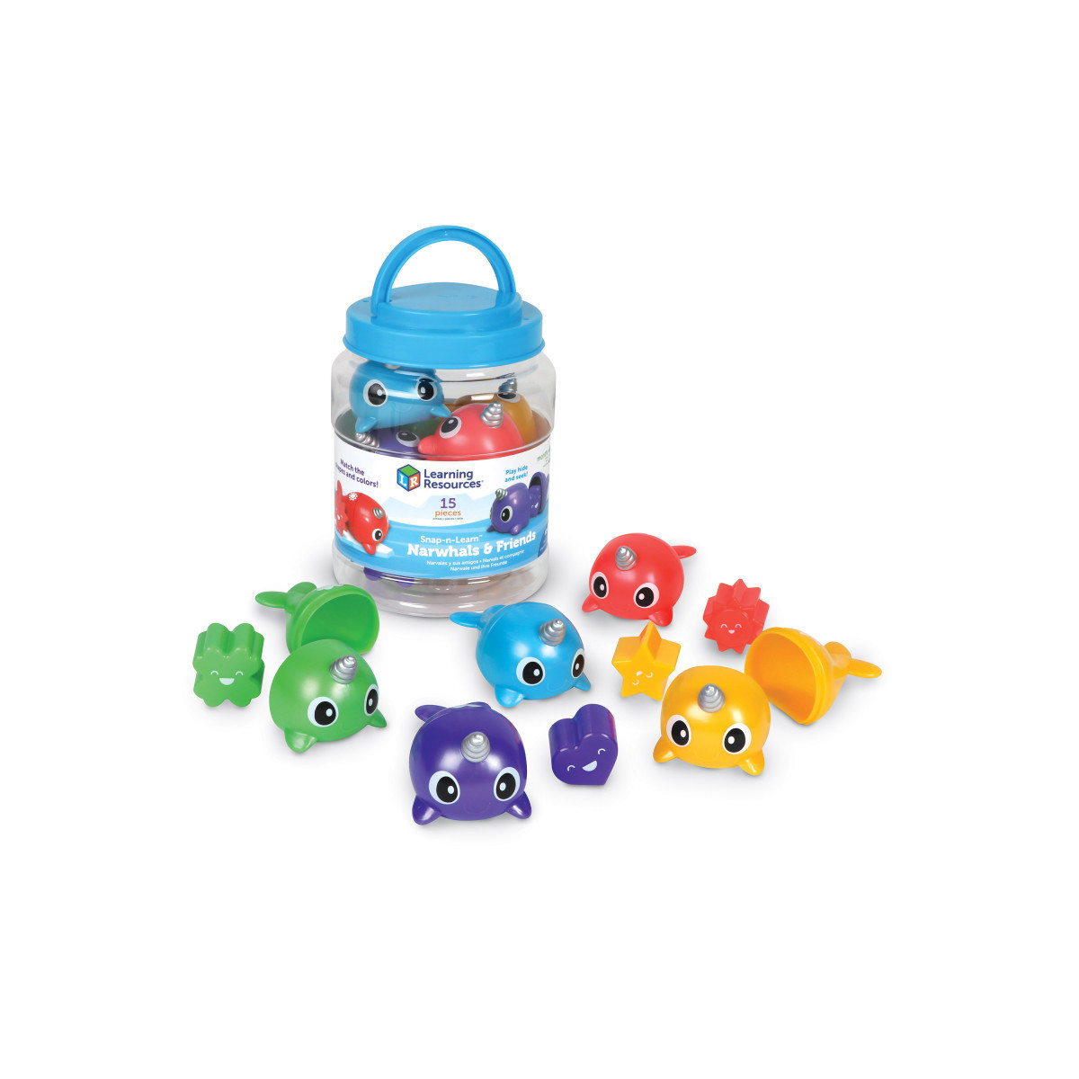 Another addition to the popular Snap-n-Learn line of toys! Narwhals and hide-inside shape friends (happy heart, smiley sun, lucky clover, and more!) help kids learn colors, build fine motor skills, and develop their imaginations. Match the bright pieces by color or shape, or mix ‘em up and play! Set features 5 two-piece narwhals and 5 shape friends in 5 colors, for 15 pieces in all. Narwhals measure 4"L x 2.25"H.