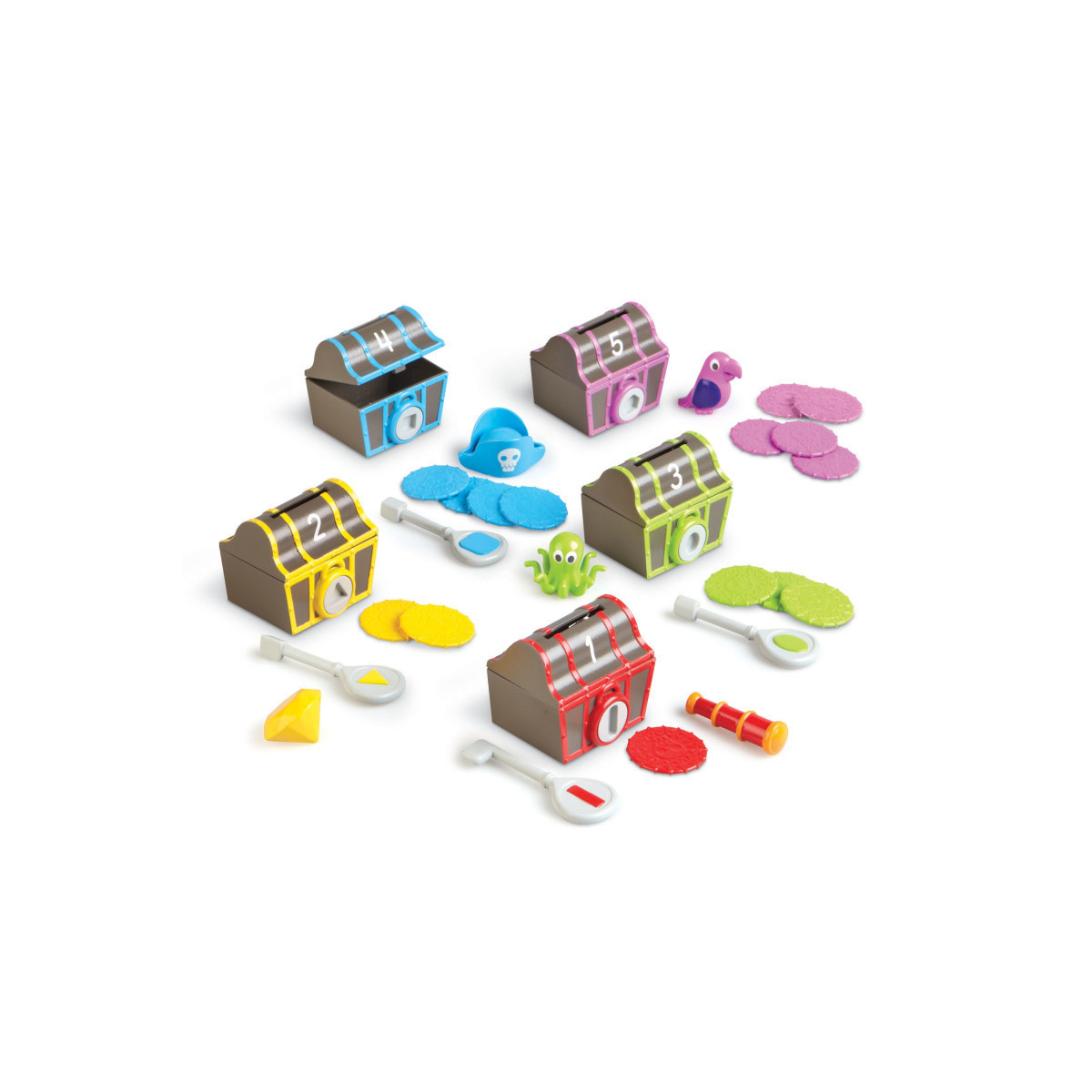 There's pirate treasure afoot, and it's packed with learning fun! Unlock fine motor fun and new sorting and matching skills with the Sorting Surprise Pirate Treasure from Learning Resources. Within each of this set's five numbered plastic pirate chests hides a colorful toy surprise; kids can discover a purple parrot, a green octopus, a red spyglass, and more! To capture their pirate treasure, kids must unlock each chest using the correct key; each lock features a different shape, so choose carefully! Sized for little hands, the keys help kids build coordination and other fine motor skills with every pop of their pirate chests. As they count up their new treasures, kids will also build color and shape identification skills, but that's not all—the Sorting Surprise Pirate Treasure also includes 15 colored treasure coins that add to the sorting and matching fun. Sort pirate treasure by color, match the coins to their toy surprises, or just drop them through the slots in the tops of the chest—with the Sorting Surprise Pirate Treasure, imaginative adventures never end!