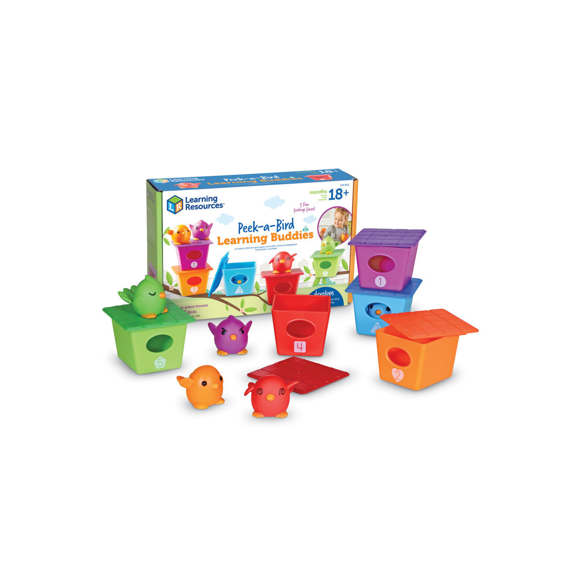 These colorful birdies are ready for high-flying learning fun! Kids learn counting, colors, matching, sorting, social-emotional learning skills, and more through fun toddler activities with the friendly birds found within the Peek-a-Bird Learning Buddies set from Learning Resources. Each of this educational toy set's 5 numbered two-piece bird houses comes in a different vibrant color, including red, orange, blue, green, and purple. Each bird house also pops open to reveal 5 different birdy finger puppets, each of which sports a different facial expression—help kids identify happy, shy, sleepy, and more! Unlike many educational toys for 18 month olds, the Peek-a-Bird Learning Buddies grow along with your little one—build new imaginative skills during early games of pretend, then move on to using the birds as early math and color teaching toys! Find the birds during games of hide and seek, make your own matching toddler activities, or just let your imagination go! The two-piece bird houses in this educational toy set also help kids build coordination and other fine motor skills every time they pop them open or snap them shut.