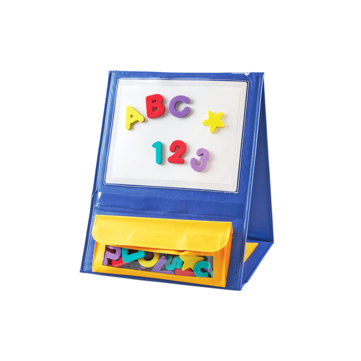 This self-standing, double-sided pocket chart features a magnetic write-on/wipe-off board on top and three storage pockets. Has a sturdy handle and collapses for easy storage. Use with magnetic tiles or magnetic letters or numbers (sold separately). Chart measures 12.25"W x 14.75"L x 4"H.