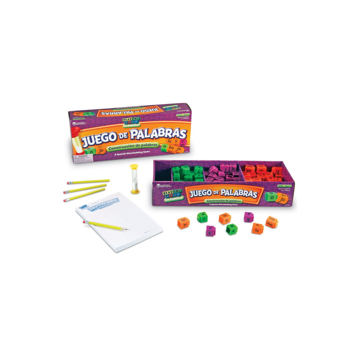 The fast-paced fun of Word for Word® Phonics Game is now available in Spanish! Using all 4 sides of their Reading Rods®, players build as many words as they can in 2 minutes. Players may exchange Rods with the center pile as needed. When the time is up, switch Rods with their neighbors and keep on building! Score extra points for using more than 2 Rods in any word. Includes 126 color-coded Rods, score pad, pencils and 2-minute timer. Compatible with our Spanish Reading Rods® Fonetica y Vocabulario products.