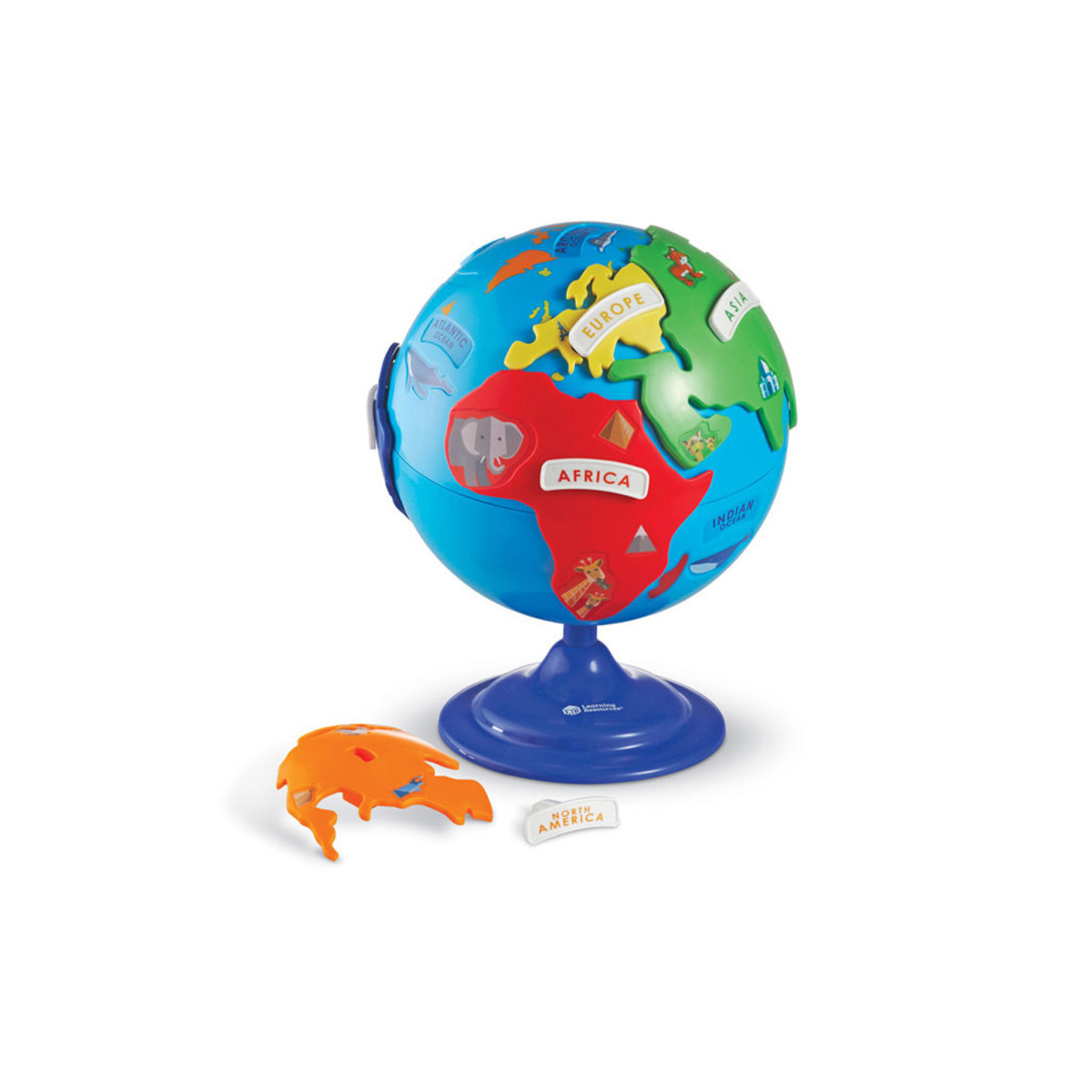 PUZZLE GLOBE FOR KIDS: The globe's 6 puzzle pieces represent Asia, Europe, Australia, Africa, and North and South America, while a stationary bottom piece represents Antarctica