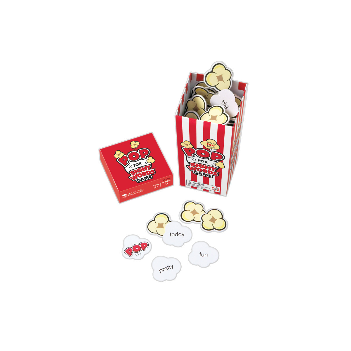 Students will gobble up handfuls of fun as they recognize and read aloud sight words. Improves fluency as children pick word cards from the popcorn box, and keep all the words they can read correctly. Engages children with colorful popcorn graphics and competitive game play. Each game includes 100 die–cut popcorn cards—92 sight words and 8 POP cards that put all your word cards back into the carton. Supports a variety of early literacy activities, thanks to the word cards that can be used on their own. Popcorn game box measures 3"L x 3"W x 6.25"H. For 2-4 players. Grades K+.