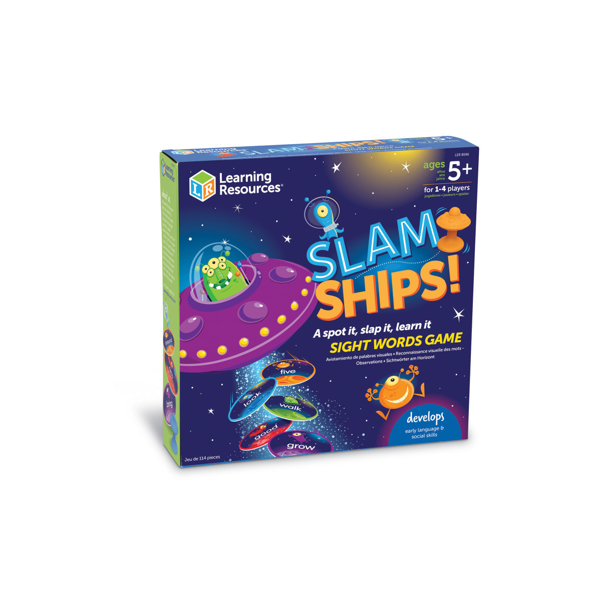 It's the hear-it, see-it, slam-it sight word game of cosmic proportions! Kids build new vocabulary and word recognition skills during every out-of-this-world play time with the Slam Ships! Sight Words Game from Learning Resources. Start by grabbing one of 4 colorful UFO slammers, each of which comes with a suction cup base, and spreading out some of the set's sight word cards across the table. After one of the sight words is called out, spot the card with the word on it, then slam down your UFO to capture and collect it. Like our other swat games, the player with the most sight word cards at the end of the round wins! Every time they slam, kids build the vocabulary and word recognition skills they need to succeed at reading, spelling, and all sorts of language arts. The Slam Ships! Sight Words Game also grows with them: the set's 110 double-sided sight word cards come in 5 different vocabulary levels that help you increase difficulty and introduce new concepts for a fun twist on kindergarten games.