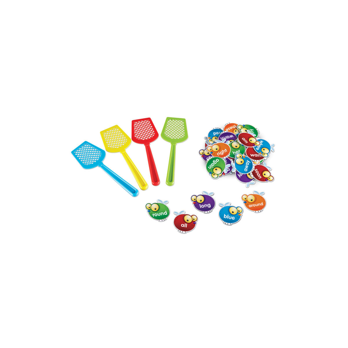 Learning essential words is fun with these friendly flies featuring 220 Dolch sight words. After a sight word is called out, race to swat the matching fly. Collect the most flies and win! Set features various game instructions and 5 levels of play for 1-4 players. Includes 110 double-sided sight-word flies and 4 colorful swatters measuring 9"L.