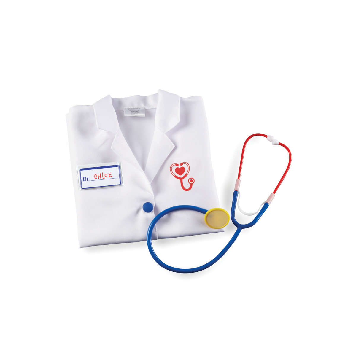 Provide the perfect dose of imaginative play with this customizable doctor's coat and stethoscope. Kid-friendly snaps make coat easy to put on and take off. Fits most children ages 3-6. Includes write-and-wipe nametag for personalization.