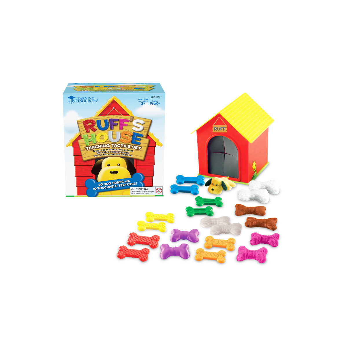 Reach in and feel all the textures! Help the fuzzy dog find all the bones he hid in his doghouse. All bones are textured and made out of rubber or cloth and feature smooth, silky, scratchy, bumby, ridged and more textures. Includes: Ruff the dog. 20 bones (10 textures — 2 of each texture). Doghouse. Activity guide. Doghouse measures 5"L x 5"W x 5"H, each bone measures 2"L. Grades: PreK+. Learning Style: Visual, Tactile. Skill Development: Language- Learning how to identify the textures of Ruff's bones in words helps students expand their descriptive language abilities. Fine Motor- Grasping, exploring, and manipulating the different textured bones leads students to further develop their ability to use their fingers and hands purposefully and improve manual dexterity. Math- Ruff has 20 bones. How many does he have left if he hides 3 in his house? There are two bones outside and two bones inside Ruff's house. How many does he have in all? Early math games can prepare students for math success and Ruff and his bones are ready to play.