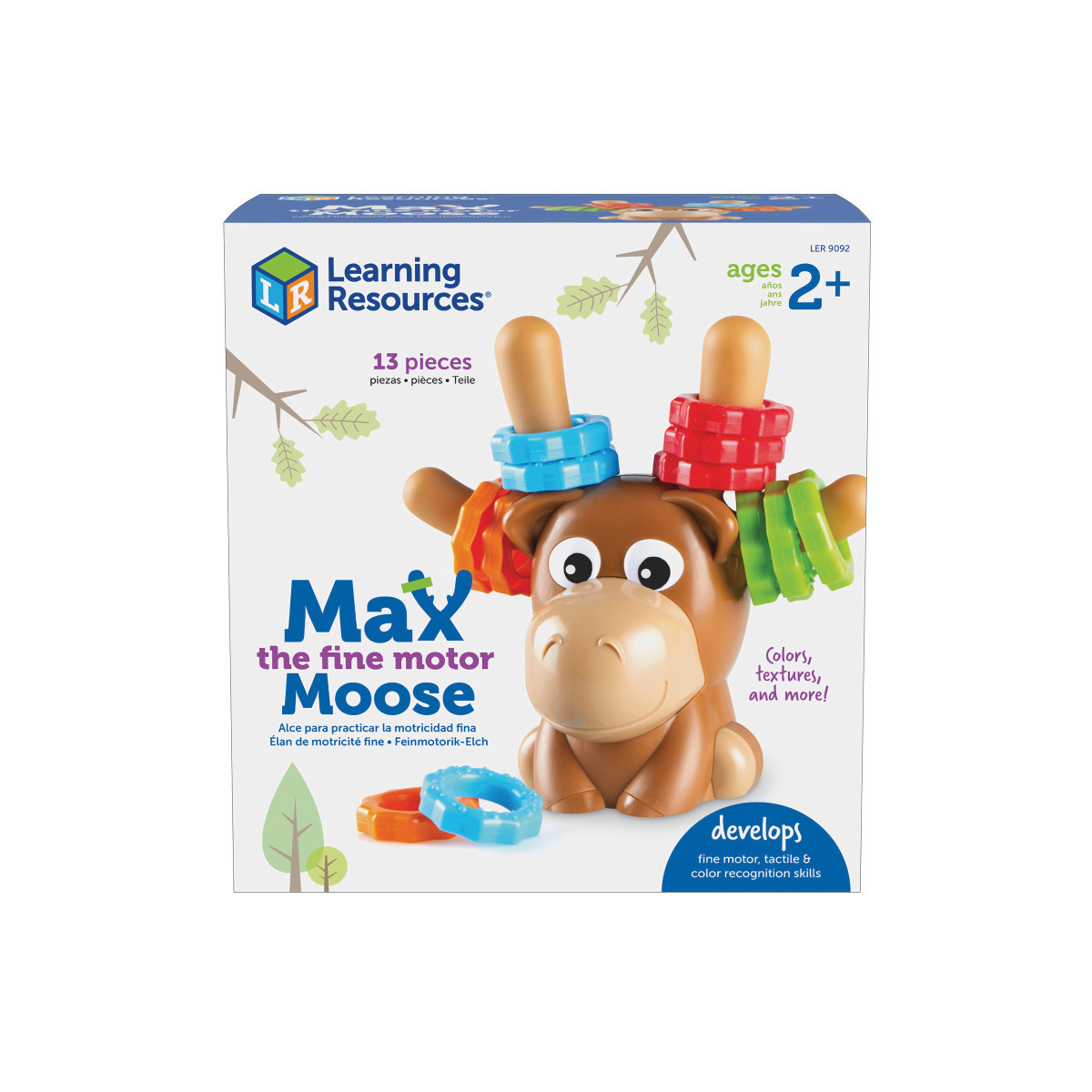 Meet your arctic fine motor friend! Kids build the hand strength they need to succeed in school and beyond every time they play with Max the Fine Motor Moose from Learning Resources. The friendliest fine motor toy for toddlers, this mighty moose comes with 12 grabbable rings, whose easy-to-grasp surfaces make it easy for kids to build their coordination, hand strength, and other essentials of fine motor skills development. Max's rings also come with a 3-in-1 learning surprise—in addition to building fine motor skills, the rings also come with two different textures that support tactile play, and introduce kids to early color matching thanks to their vibrant designs. Explore the rings' smooth and bumpy surfaces, sort them into warm and cool colors, and more—with Max the Fine Motor Moose, there are always multiple ways to learn. When the fine motor fun is finished for the day, Max's durable plastic rings wipe clean and fit inside for easy storage.