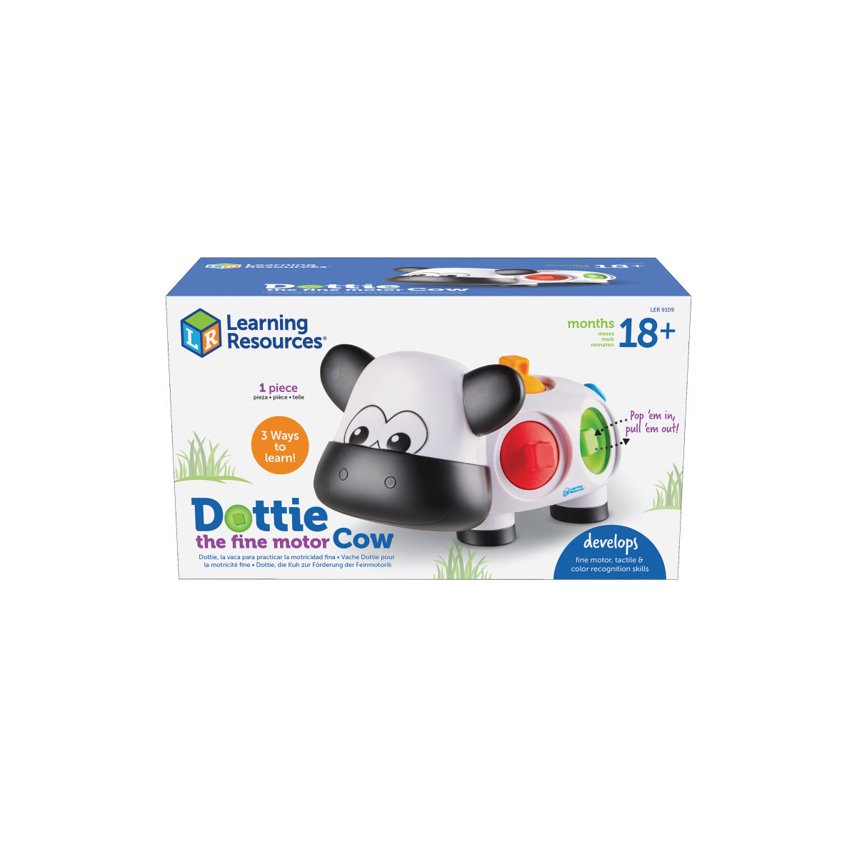 Dottie and her colorful dots are ready for preschool fine motor fun! Whether they're learning in preschool or through homeschooling, toddlers build the whole-hand skills they need every time they play with Dottie the Fine Motor Cow from Learning Resources! The friendliest fine motor toy for toddlers, this adorable cow toy comes with 5 attached pull-out push-in dots that make it easy for toddlers to build their pincer grasp, whole-hand pulling, and other essentials of preschool fine motor skills and tactile play. Dottie's dots also come with a bonus learning surprise—in addition to building fine motor and gross motor skills, this preschool toy also introduces toddlers to early preschool color skills. Best of all, Dottie the Fine Motor Cow, is an all-in-one learning toy. Since her dots are always attached, there's no extra clean-up needed when the preschool fine motor fun is finished for the day! Dottie measures approximately 9.5" x 6" x 5".