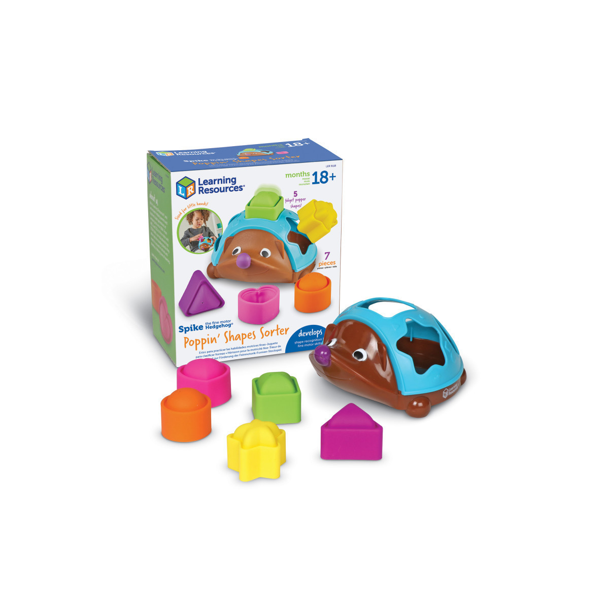 Spike is back with all new shape-sorting fun! Our newest take on the bestselling Spike the Fine Motor Hedgehog pairs classic shape sorting with fidgety popper action— match the 6 shape pieces (square, circle, triangle, heart, star, and cloud) with their corresponding holes, or fidget with their flexible popper material. Shape pieces fit inside Spike for easy cleanup. Spike measures 7.25"L x 5.75"W.