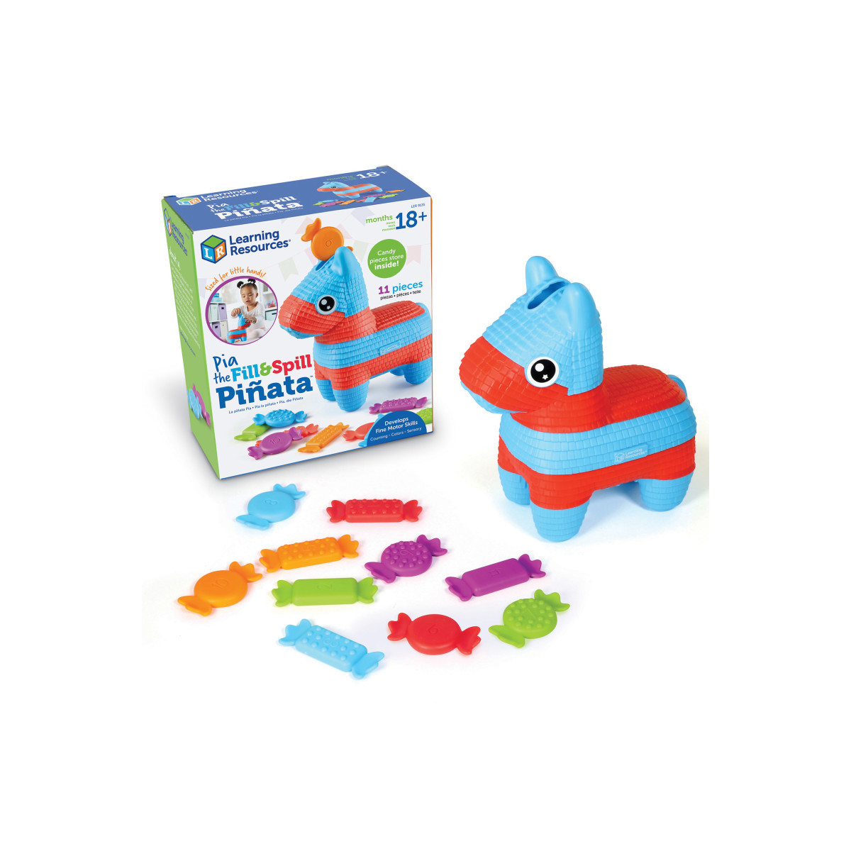 It's a fine motor fun fiesta every time you play with Pia! Whether they're learning preschool fine motor skills at home or in the classroom, toddlers build the whole-hand skills they need every time they play with Pia the Fill & Spill Piñata from Learning Resources! This adorable fine motor toy for toddlers comes with 10 colorful numbered candies that make it easy for toddlers to build counting and color skills, as well as hand strength, coordination, and other essentials of preschool fine motor skills. Here's one of Pia's fun toddler activities—drop the candies in the slot on Pia's back, then open her bottom hatch and let them all spill out! Pia also comes with other fun learning surprises—explore her unique textures and candy for fun tactile and sensory play. Made from durable, wipe-clean plastic, this top toddler toy is ready for years of learning fun. She even doubles as a therapy toy for toddlers! When the fine motor fun is done for the day, Pia's candies store inside for easy clean-up!