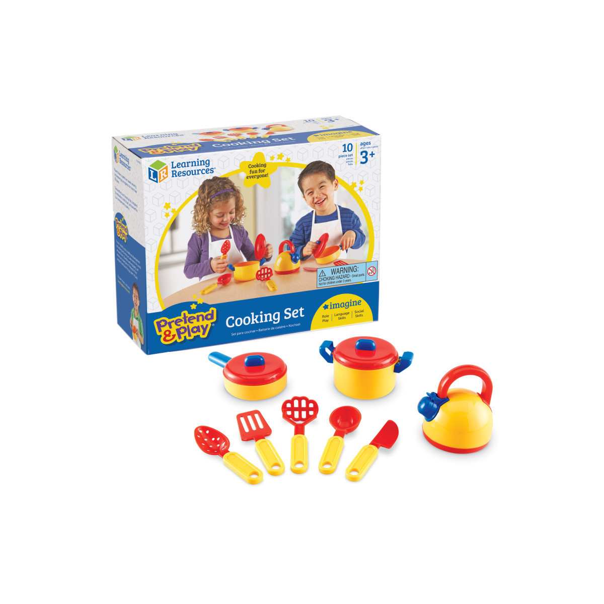 Familiar, brightly colored cookware helps children develop imaginative play skills