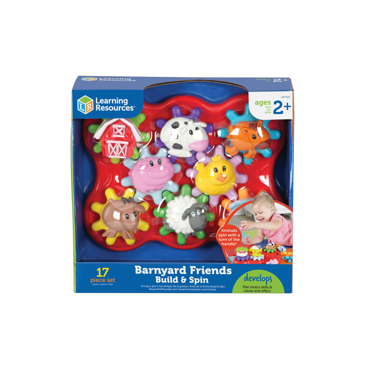 A great addition to the successful Build & Spin series that helps toddlers build motor skills through delightful, spinning gear play. The chunky gears snap into the base, allowing for take-and-play portability. Set includes 8 large gears, 7 friendly animal characters, 1 chunky farm knob, and 1 base. Featured in open packaging style that provides strong point-of-purchase appeal.