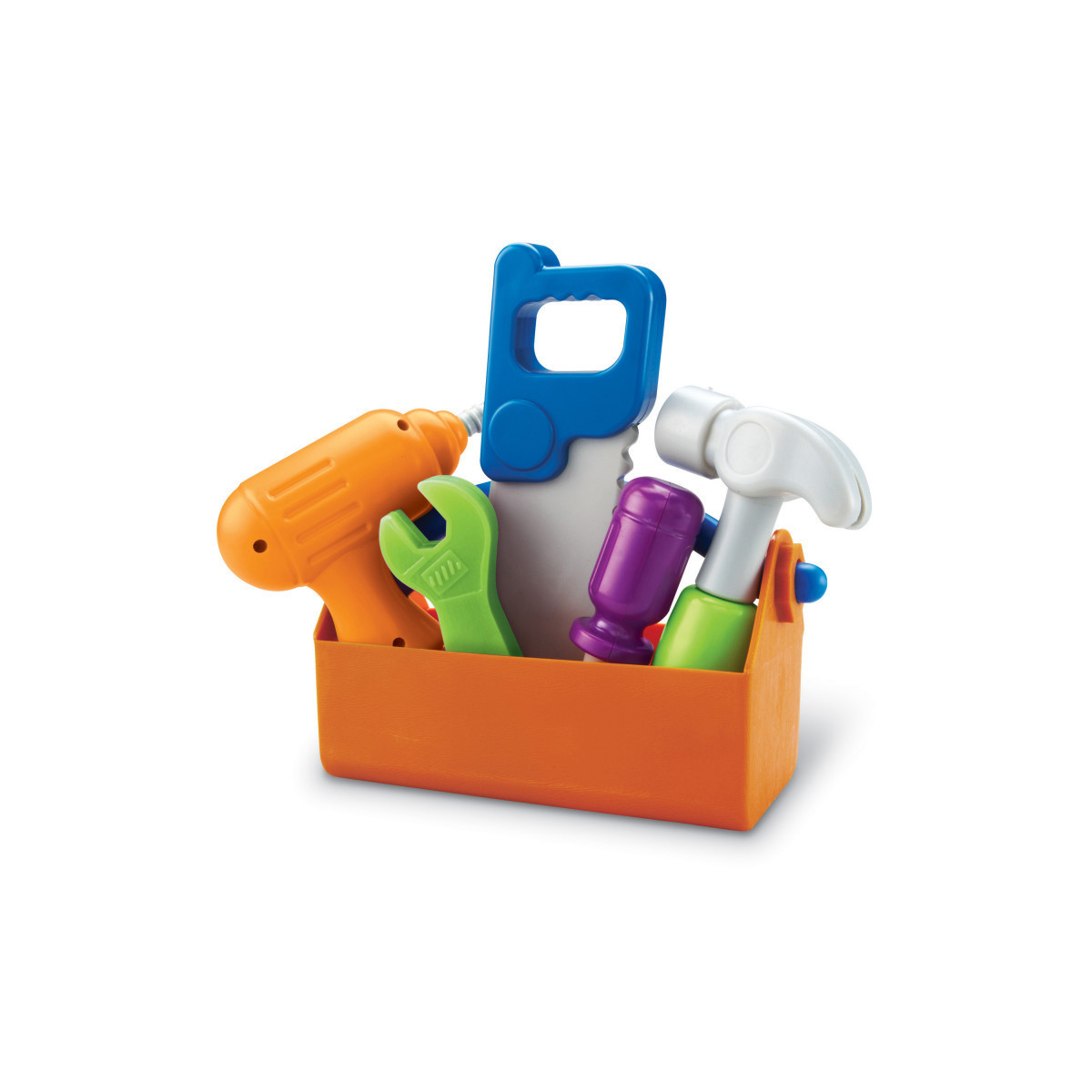 Encouraging imaginative play with chunky, toddler safe tools made from durable, soft plastic. Squeeze the drill and it makes sounds! Includes Toolbox, Drill, Saw, Hammer, Screwdriver, and Wrench. Toolbox measures 9"L x 3.75"W x 5.5"H.