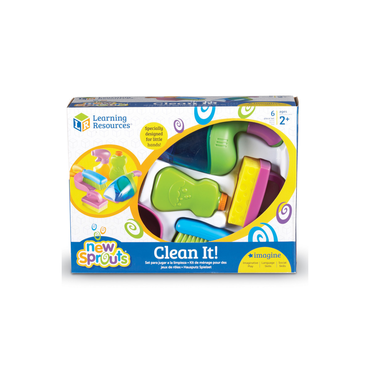 Sparkle and shine, it's cleanup time! Encourage role play and participation in keeping things spick-and-span with this helpful set. Perfectly sized cleaning tools inspire imaginative play while building early vocabulary and social skills. Little ones can have fun while lending a hand with cleaning essentials including a duster, dustpan, spray bottle, sponge, bottle of cleaner, and hand vac that rattles and rolls. Largest piece (hand vac) measures 7-1/4"L x 3-1/2"H.