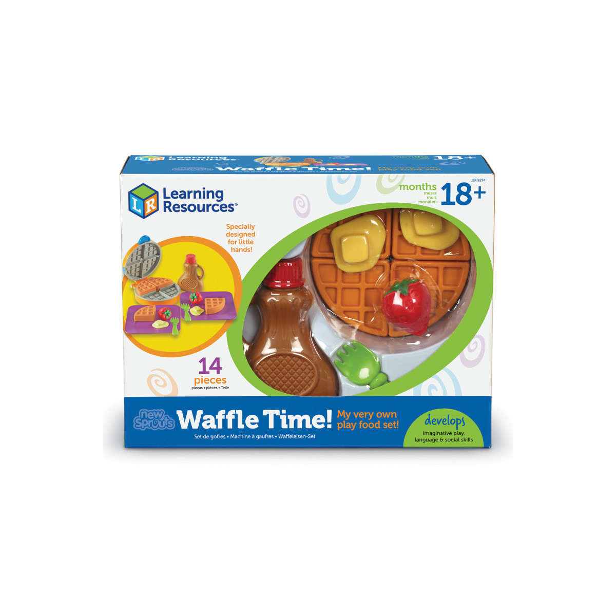 - 14 pieces include: waffle iron, 4-piece waffle, syrup bottle, strawberries, butter, 2 plates, and 2 forks
