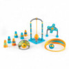 - Kids launch balls towards goal cups with the help of a three-piece adjustable pendulum