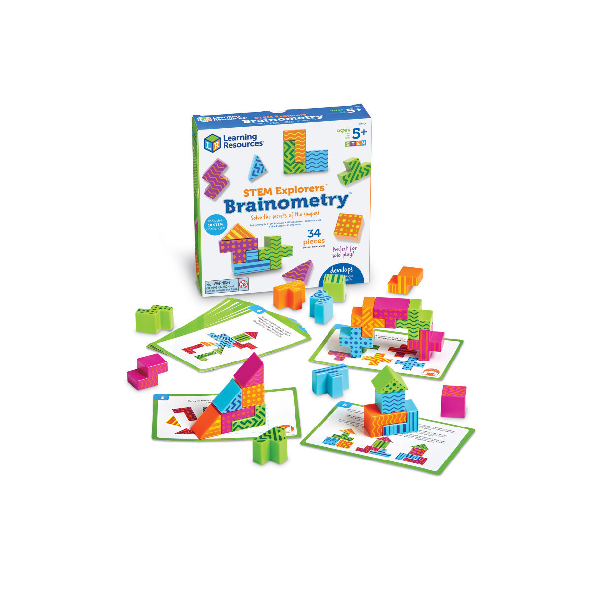 Get your brain in shape with these STEM puzzle challenges! Kids solve brain-teasing puzzles that test their knowledge of shapes, critical thinking, fine motor skills, and more every time they play with STEM Explorers Brainometry from Learning Resources! Explore this set's 10 STEM challenge cards for critical thinking puzzles that turn shape pieces into the 2D and 3D building blocks of victory! Manipulate six different shape pieces into solutions that require a keen eye for stacking, sorting, and geometry. As kids solve the secrets of the shapes, they'll also build essential STEM skills, including pattern recognition, problem solving, and more. After they master the set's progressive STEM challenges, kids can even build their own! STEM Explorers Brainometry includes 24 shapes and 10 double-sided STEM challenge cards. Largest piece (cross) measures 1.5"L x 1.5"W x 1"H. This fun learning tool is ready for homeschool or kindergarten classroom use!