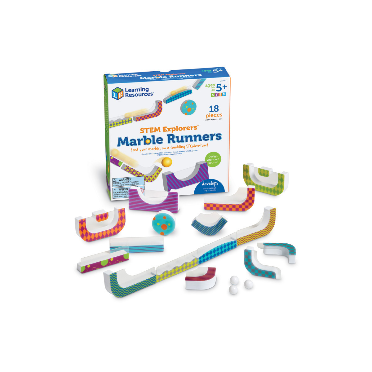 These marbles are ready to tumble down a run designed by you! Kids discover marble mayhem inspired by our Toy of the Year Award-winning Tumble Trax when they craft their own marble runs with STEM Explorers Marble Runners from Learning Resources. Using the set's cling-back pieces, kids build tracks on walls and windows to solve the included STEM challenges! As they build, test, and tweak their marble runs, kids will also strengthen essential kindergarten STEM skills, including critical thinking, problem solving, and engineering. All that building is made easy by the cling-back pieces, which require no permanent adhesive and can be used again and again! After they master the set's progressive STEM challenges, kids can even build their own! STEM Explorers Marble Runners includes 13 track pieces, 2 balls, and 10 double-sided STEM challenge cards. This fun learning tool is ready for homeschool or kindergarten classroom use!