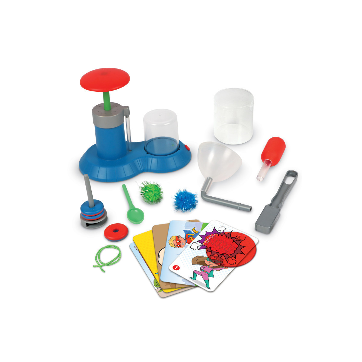 Discover the science behind the superpowers! From magnetism and color mixing to early physics feats, this set helps kids discover experimentation, observation, and other essential STEM skills. Includes full-color write & wipe guide and activity cards for even more super science! The 22-piece set includes 1 Vacuum Chamber Base with Pump, 1 Removable Vacuum Chamber, 1 Magnet Stand, 3 Double-Sided Magnets, 1 Beaker, 1 Funnel, 1 Tube, 1 Magnetic Wand, 1 String, 1 Red Reveal Lens, 1 Spoon, 1 Eye Dropper, 2 Pom-Poms, 5 Activity Cards, and Full-Color Comic Experiment Guide.