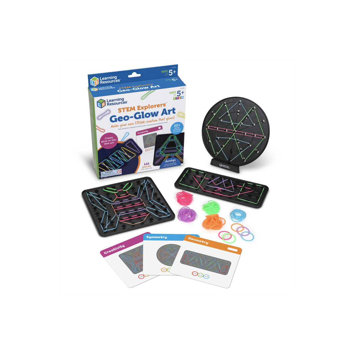 How can you help kids learn early STEM and art skills? Check out these STEAM-powered art pieces made with colorful glow-bands! As they design, craft, and display glow-in-the-dark art pieces, kids build essential screen-free STEAM skills like how to read coordinates and use critical thinking. How does this STEM toy help kids learn? It doubles as an interactive coding toy for kids, introducing screen-free coding fundamentals through hands-on play. Whether they're following along with the included designs or making up art of their own, kids can use the STEM toy's three durable plastic pegboards and 100 removable glow-bands to craft and recraft new creations again and again! Best of all, the STEM Explorers Geo-Glow Art set makes an easy addition to collections of classroom STEM activities and kids coding toys. STEM Explorers Geo-Glow Art helps kids develop critical thinking and early geometry skills. The largest piece in this set (the square pegboard) measures 6.5" x 6.5" x 0.5".This set includes 122 pieces. What is this toy made from? Our toys are made from durable, wipe-clean plastic that's designed for years of learning fun. Age 5+ | Grade K+