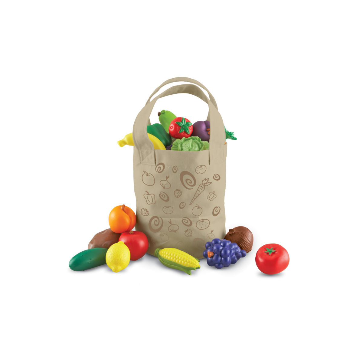Fill a tote with nutritious, freshly designed product and invite early dramatic play! Made from soft, non-toxic plastic. Perfectly sized for small hands. Includes canvas tote, apple, tomato, strawberry, apricot, carrot, lettuce, pear, cucumber, berry cluster, plum, grapes, corn, banana, lemon, onion, and potato. Canvas tote measures 8"H x 9"W. Age: 2+/Grades: Toddler+.