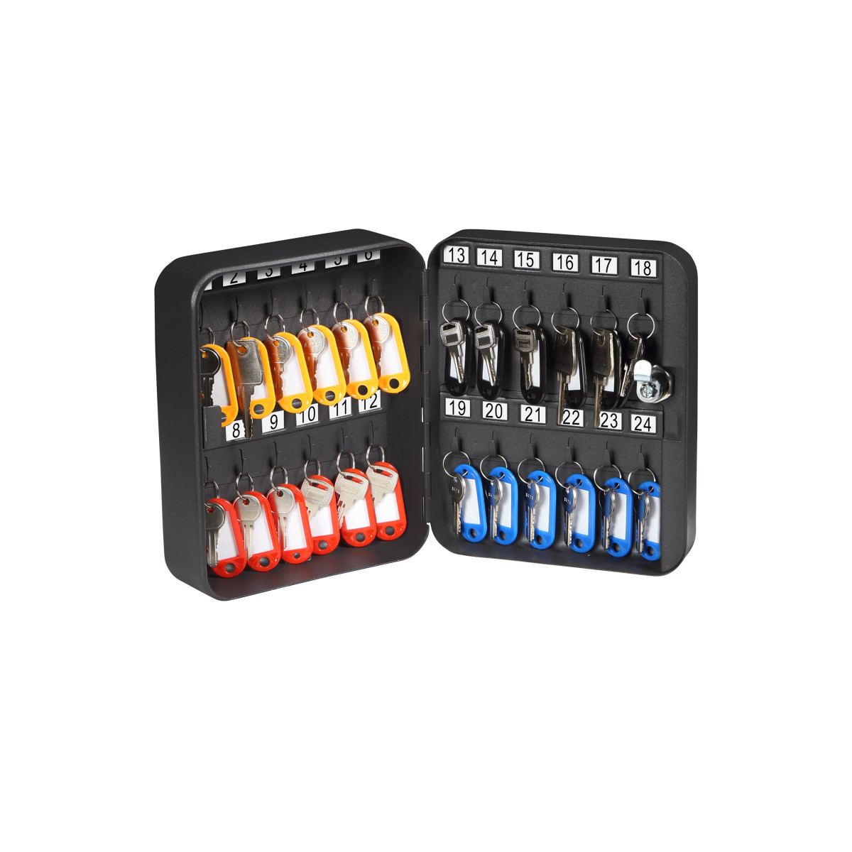 This Honeywell model 6105 steel 24 key security box features 24 key hooks with 24 key rings and tags included. This security box is key locking with 2 entry keys included, has a durable, scratch resistant powder coat finish and pre drilled holes with all mounting hardware and instructions. This Honeywell security box is backed by a 1 year limited warranty.