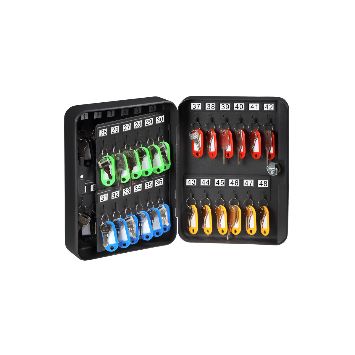 This Honeywell model 6106 steel 48 key security box features 48 key hooks with 48 key rings and tags included. This security box is key locking with 2 entry keys included, has a durable, scratch resistant powder coat finish and pre drilled holes with all mounting hardware and instructions. This Honeywell security box is backed by a 1 year limited warranty.