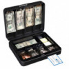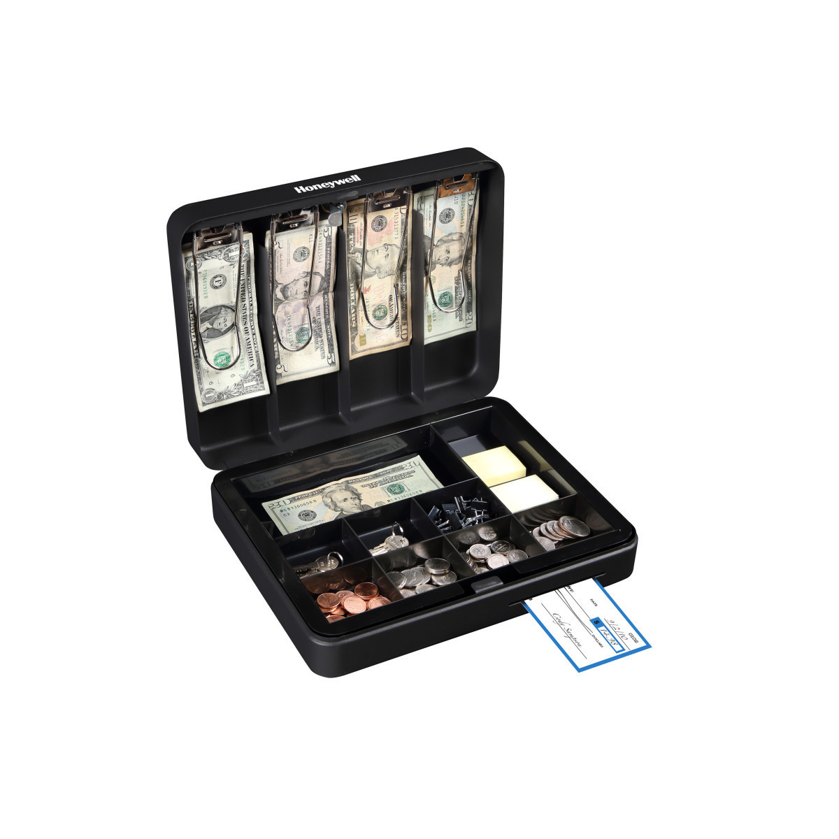 The Honeywell model 6113 deluxe cash box includes a removable cash tray with 1 bill slot, 8 coin slots, and 4 currency clips in lid. This cash box also has a convenient check deposit slot on front. It features a durable, scratch-resistant powder coat finish, additional storage under tray and a convenient carry handle. This Honeywell security box is backed by a 1 year limited warranty.