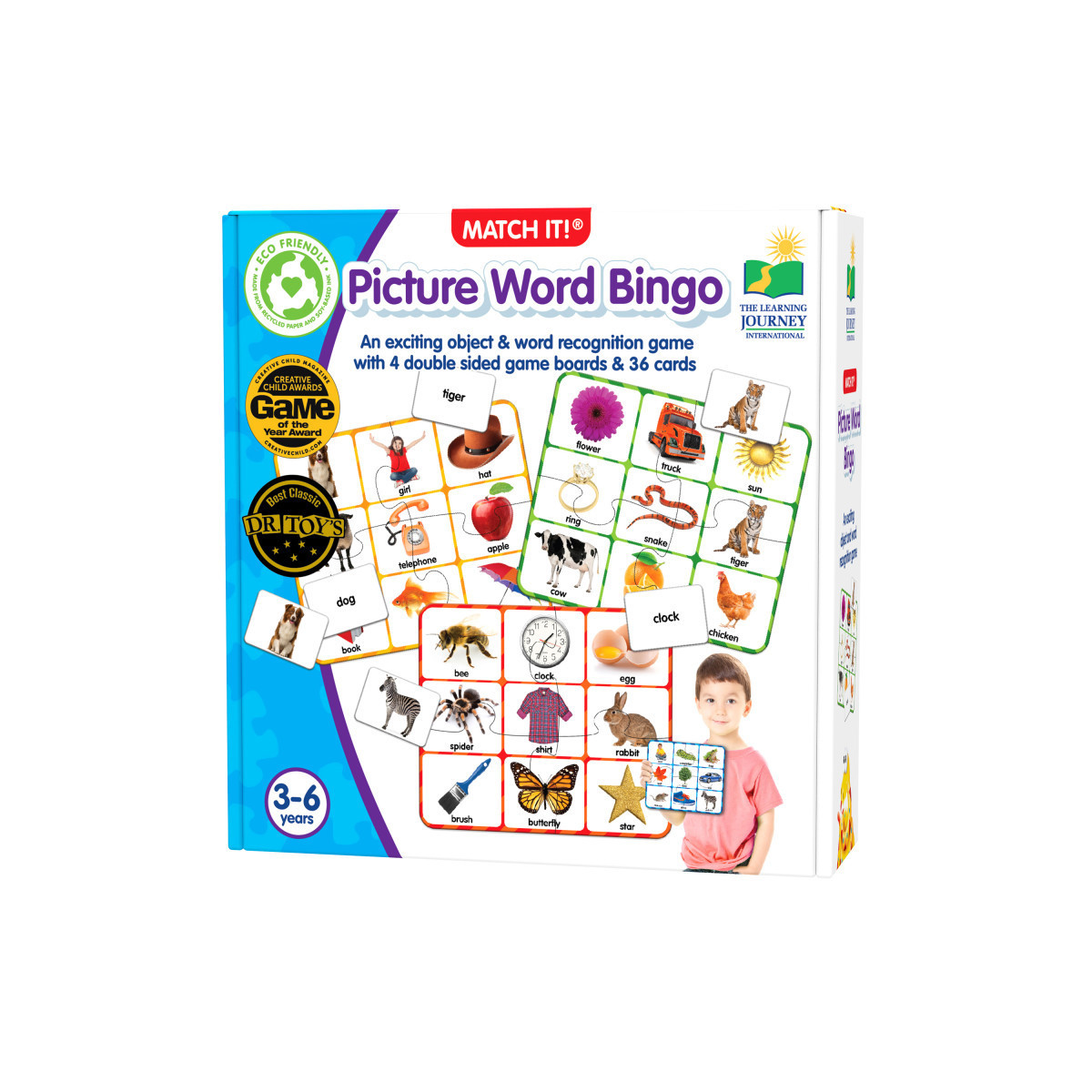 Match It! Picture Word Bingo is designed to assist children with object and word recognition, perfect for beginning readers, and to boost self-esteem when making correct matches. By matching the picture word cards on the playing boards, children will enjoy valuable learning experiences in a fun and easy way. Picture Word Bingo includes four double sided game boards, 36 picture word cards, and suggestions for different ways to play the game. For two to four players. Recommended for ages 3+ years.