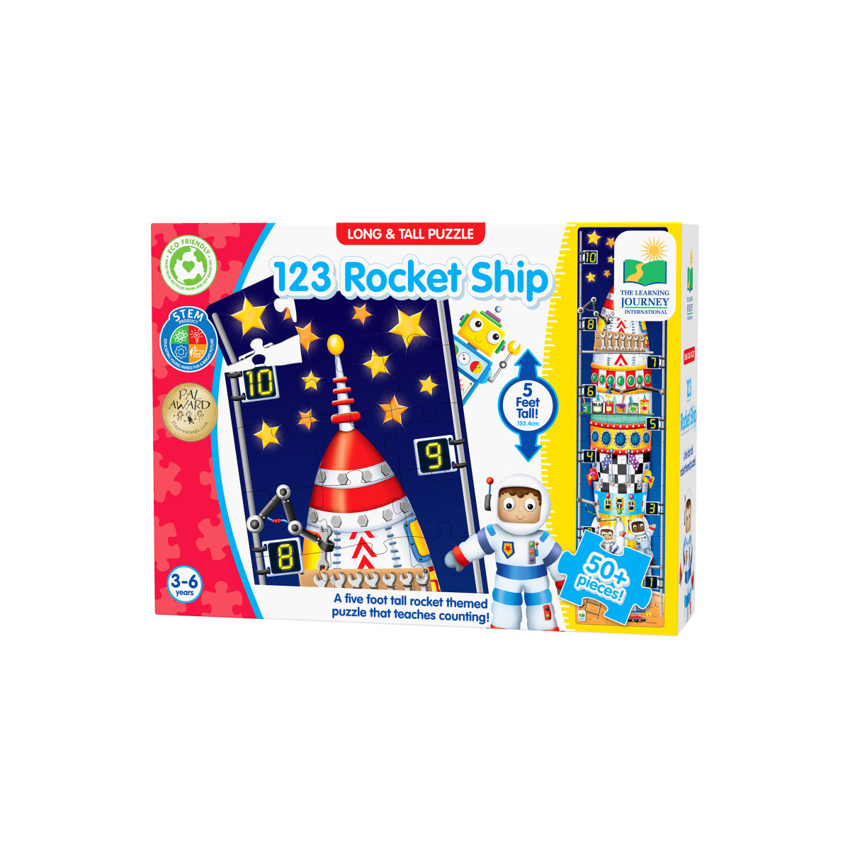 Count down to learning with our Long & Tall Puzzle series. The 123 Rocketship puzzle features numbers and as you build the rocket, you will find and count objects that correspond to the numbers they are near. This jumbo puzzle has 51 pieces and measures 5 feet tall! Ages 3+ years.