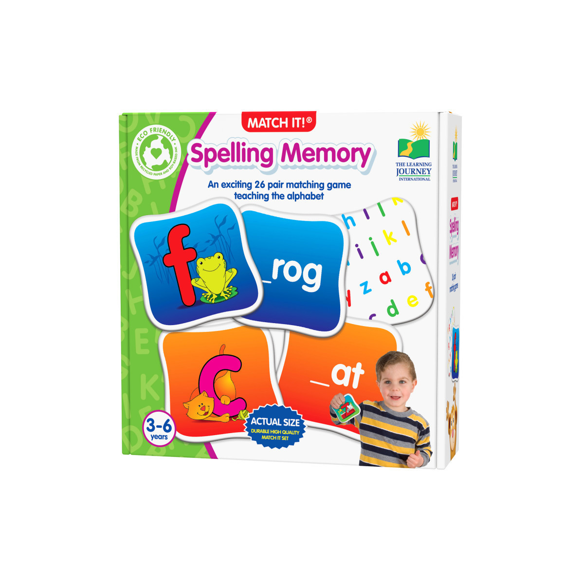 Match It! Spelling Memory is a fun memory game that will challenge problem solving and develop memory skills of young children as they try to find a pair of matching cards that complete the word. Bright, colorful illustrations teach children spelling and letter recognition. A great family game for all ages. The Match It Memory series is a fun game series that will challenge problem solving and develop memory skills of young children as they try to find a pair of matching cards. Bright colorful illustrations will introduce a variety of themes including alphabet, mathematics, counting, first words and spelling and also encourage discussions between parent and child. Match It Memory games are great family games for all ages. This spelling-themed game of memory includes 26 double-sided matching pairs. Ages 3+ years.