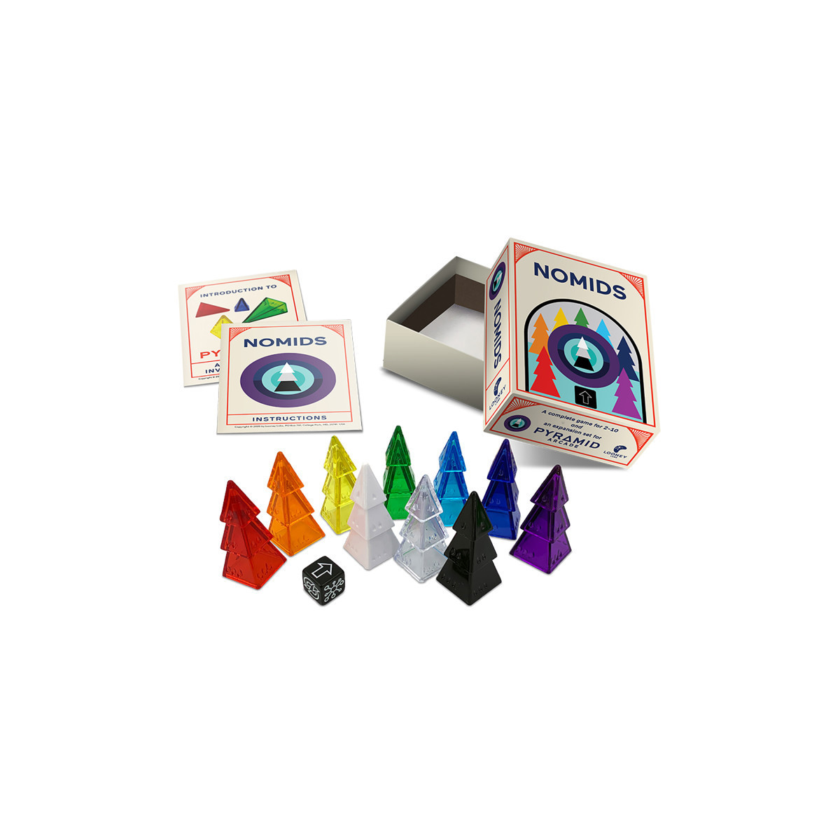 A fast and easy introductory game with a simple goal. Great for all ages and playable by as many as 10 people! Everyone starts with 3 pyramids of all different colors, and the first player to get rid of them all – to have no ‘mids – is the winner! Nomids also includes overviews of 3 other games you can play with the pieces.