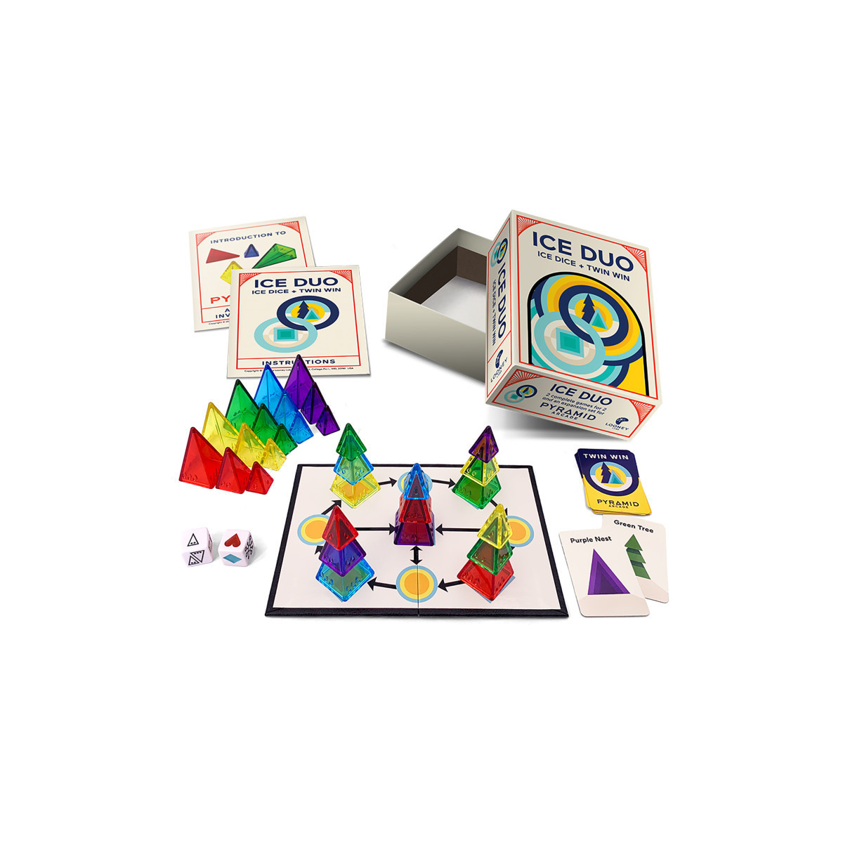 Ice Duo is actually two complete games in one box: Ice Dice and Twin Win. Ice Dice is a press-your-luck game that was specifically designed to be an introductory game for the pyramids. It features a special pair of dice designed for this game but useful now for many others. Twin Win is a quick little hidden goal game with a bit of bluffing and a bit of strategy.