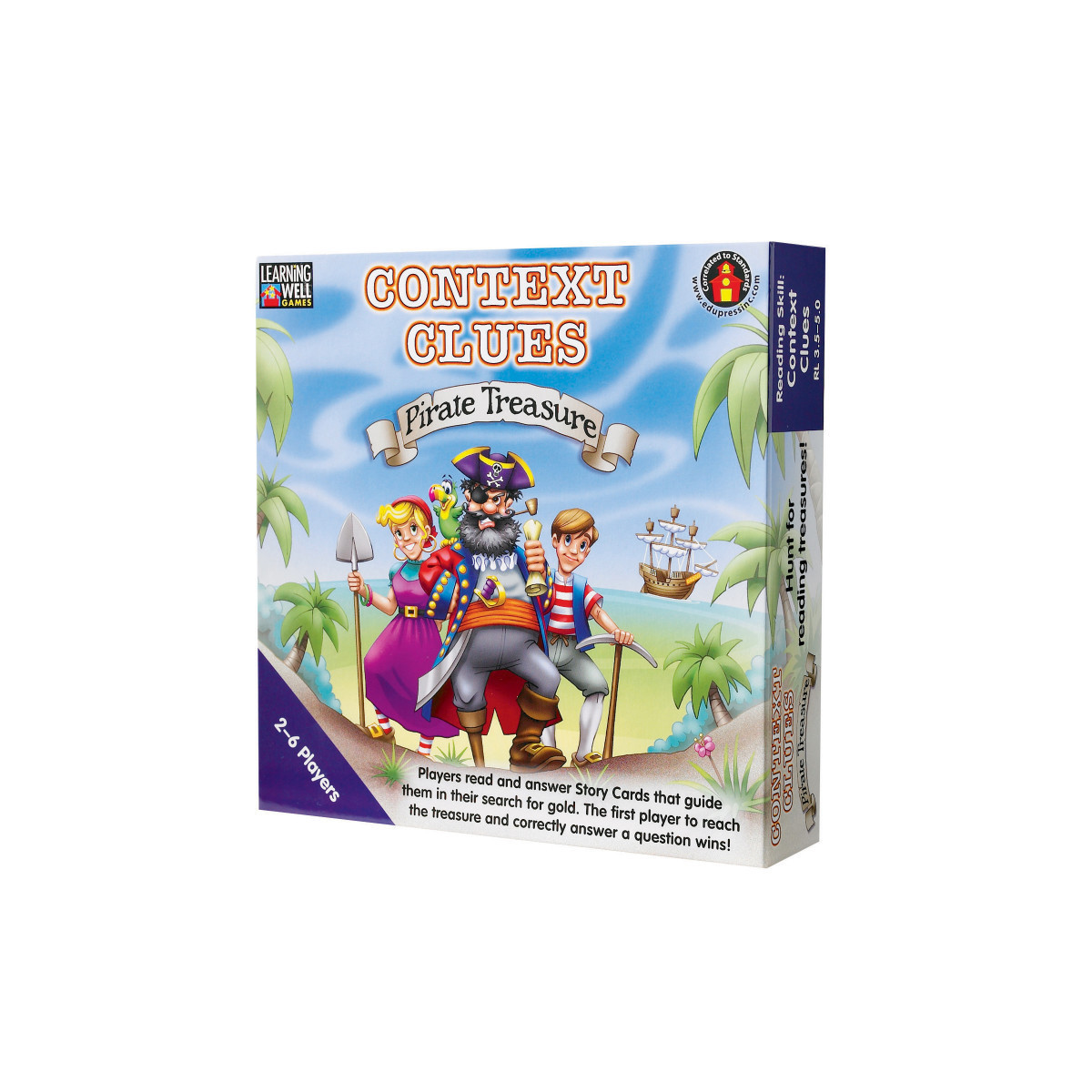 Players make their way across a tropical island in a search for gold. As they roll the die, they follow paths toward four gold coins. Along the way, they read and answer story cards that feature leveled passages and use context clues to find the answer to a question. The first player to find the gold coin marked "Treasure" and correctly answer a story card wins!