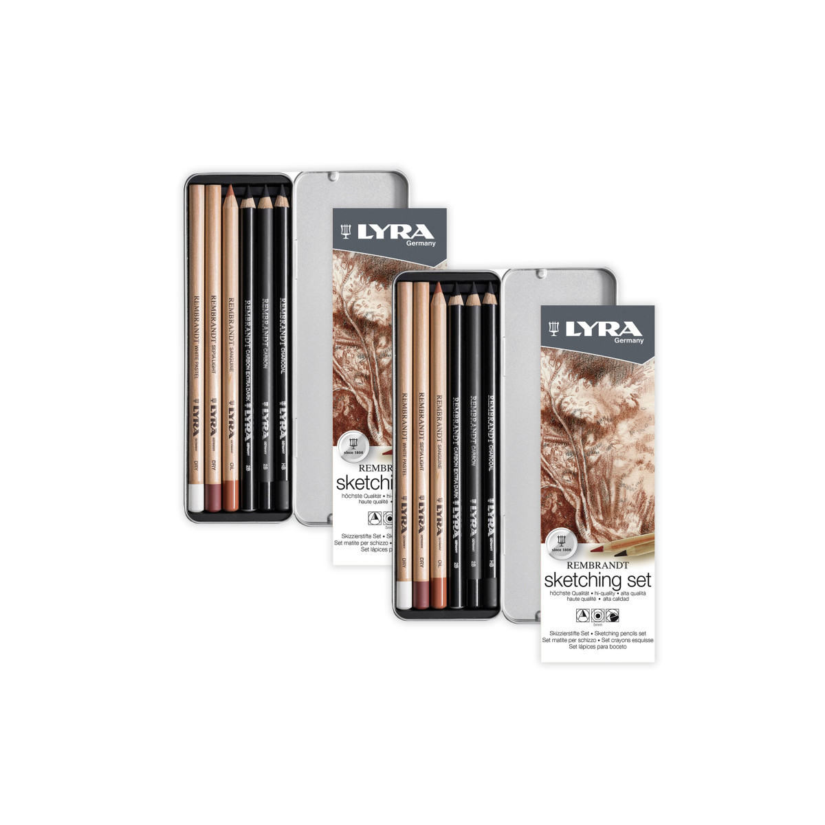 Introducing Lyra Rembrandt Monochrome professional graphite, charcoal, and natural tone pencils. Ideal for both sketching the foundations of a masterpiece and creating polished portraits and landscapes, this range is a must-have for discerning artists. The collection includes Sanguine, Sepia, and Pastel pencils available in both Dry and Oil varieties, expanding your creative possibilities. The Dry pencils are expertly balanced with pigment and binder, allowing for effortless blending and erasing, while the Oil pencils provide a rich, pasty stroke for bold, defined contrasts. With 5mm diameter leads packed with highly concentrated pigments, these pencils deliver deep, intense tones that make your artwork stand out. Having spent over 200 years providing quality products to artists, schools & offices all over the world, the historic LYRA brand — founded by Johann Froescheis in Nuremberg in 1806 — is one of the oldest pencil companies in the world. Synonymous with innovation & quintessential German quality, Lyra is a well-respected name all over the world. Ever since it produced its first pencils, Lyra has stuck to strict rules to ensure the utmost quality — from the selection of raw materials right through to the manufacturing process. Each set includes Carbon Pencil 2B, Charcoal Pencil Hb, Carbon Extra Dark Pencil 2B, Sanguine Oil Pencil, Sepia Light Dry Pencil, White Pastel Dry Pencil. Sold as 2 sets for a total of 12 pencils, 2 metal tins.