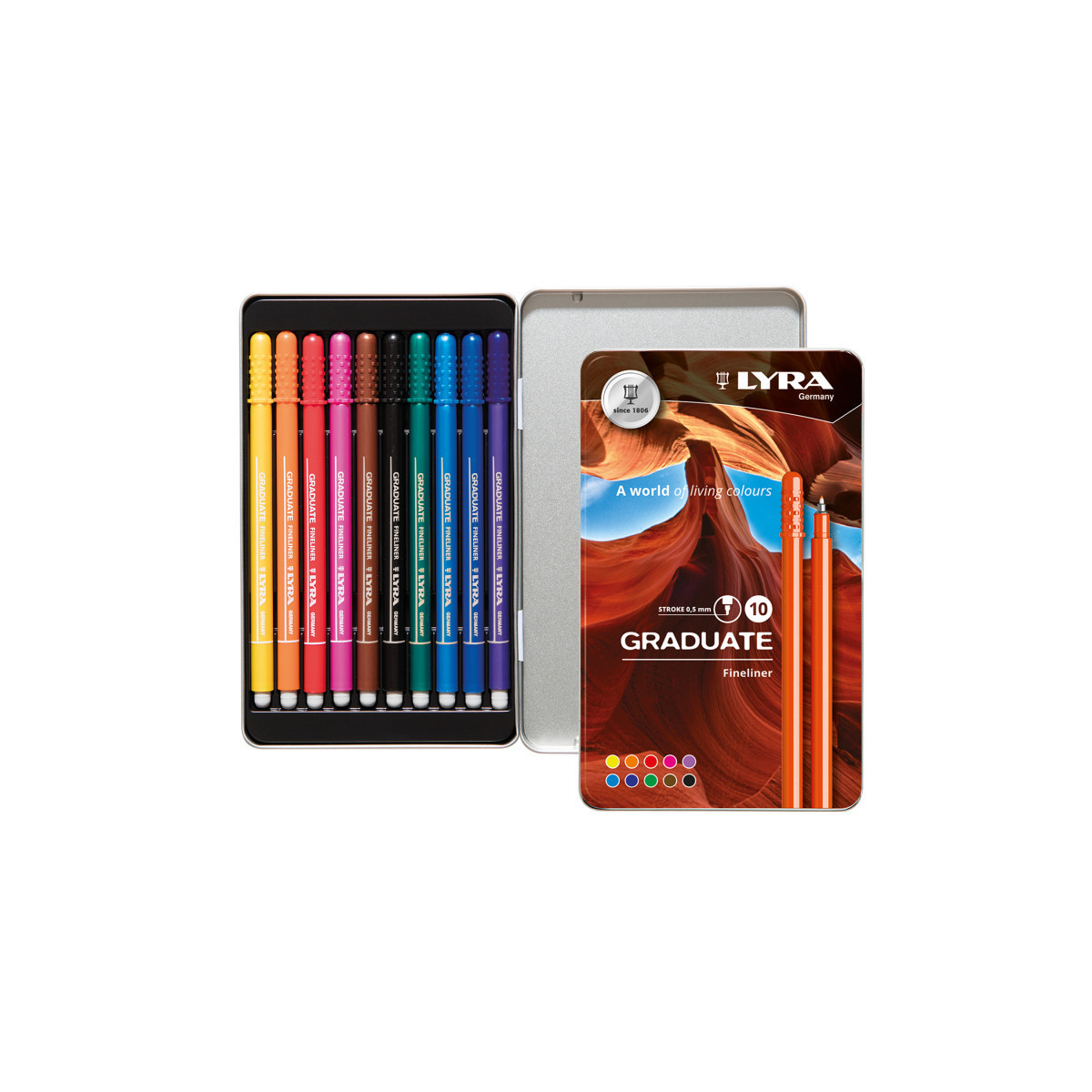 Lyra Graduate Fineliner Markers deliver sharp, precise lines that make detailed illustrations, hand lettering, and intricate designs come to life. Bursting with vibrant, fade-resistant ink, these markers empower students to create bold, eye-catching art that stands the test of time. With a comfortable grip and effortless control, they're the go-to tools for transforming classroom projects and elevating artistic skills at home. Having spent over 200 years providing quality products to artists, schools & offices all over the world, the historic LYRA brand — founded by Johann Froescheis in Nuremberg in 1806 — is one of the oldest pencil companies in the world. Synonymous with innovation & quintessential German quality, Lyra is a well-respected name all over the world.