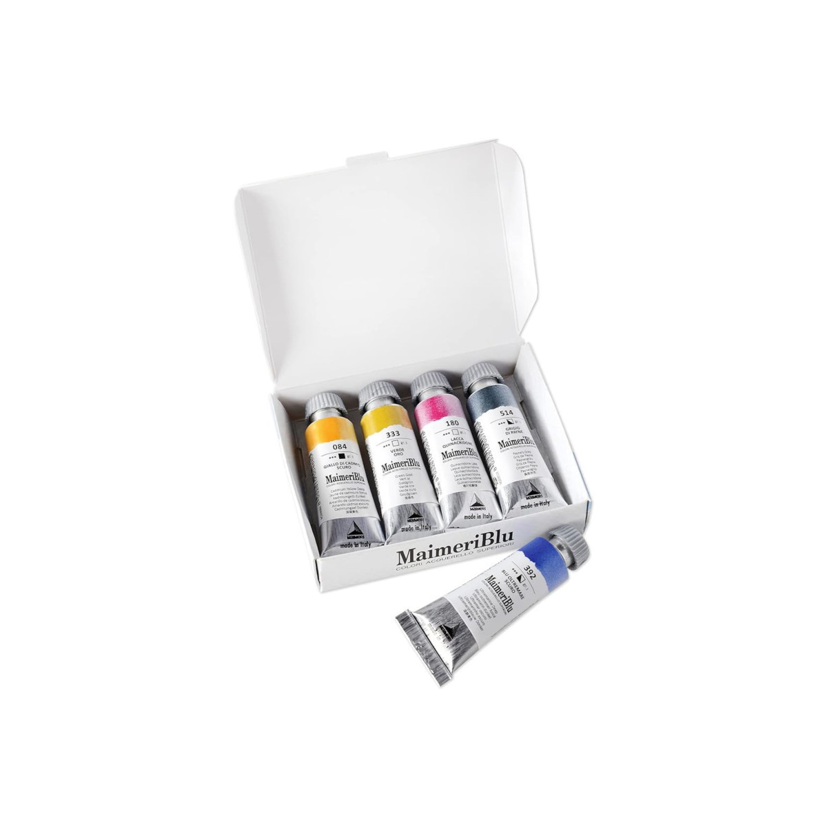 MaimeriBlu Professional Watercolors is a full range of 90 single-pigment watercolors. MaimeriBlu features an absolute purity of pigments that, together with Kordofan Gum Arabic, compose the totality of the mixture. Imperceptible, transparent, clean. No blending powders, and no additives. Nothing harmonizes or synchronizes the shift between the various shades. It is up to the artist’s skill to orchestrate and handle different characteristics, particularities and traits. The real value lies in the transparency of its colors and in the freshness of its washes. It is the whiteness of the paper that illuminates this type of painting. The light is behind the color. All colors have the maximum lightfastness. Each Introduction Set includes (5) 12ml tubes of paint in Cadmium Yellow Deep, Quinacridone Lake, Green Gold, Ultramarine Deep, and Payne's Grey. Contents may vary. Conforms to ASTM D-4236.